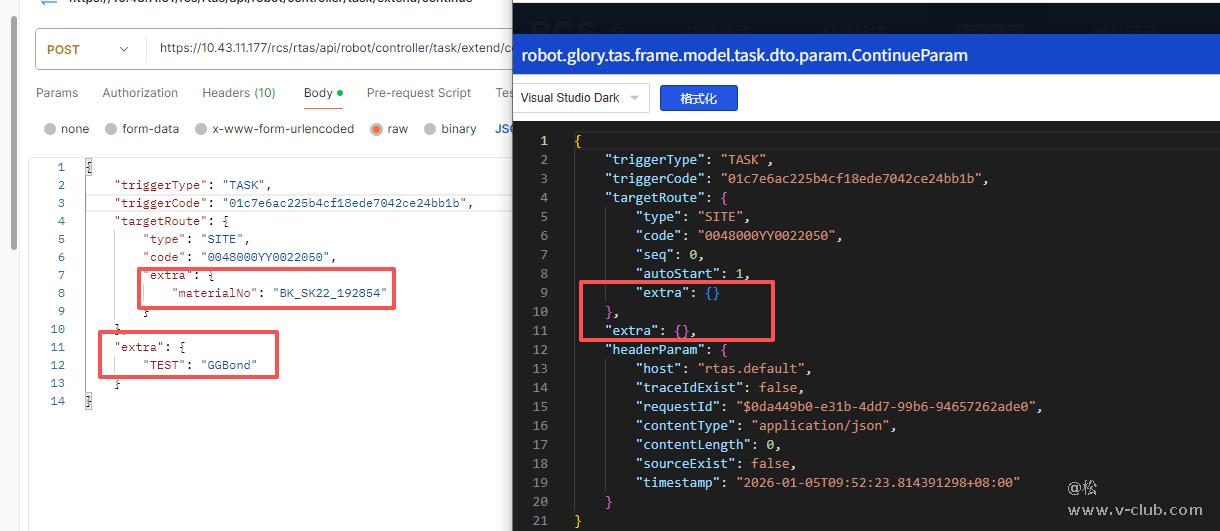 试了一下,发现直接写的话拿不到参数(任务流程-流程实例-continueParam对象里面可以看到),extra赋值了,但是TargetRoute和body里面的extra都拿不到
