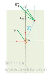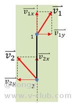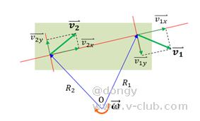 刚体上任意两点的速度不一定相同,但两点的速度在沿着其连线方向上的投影必定相同。如下图,假设现在两点分别具有线速度,两者在连线上的分量必定相等: