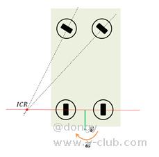 为了保证移动机器人在运动过程中每组舵轮都处于纯滚动状态,在转向时各组舵轮轴线都必须交于同一点(瞬心),下图为一般汽车阿克曼结构底盘(前轮转向,后轮定向)受到的约束。